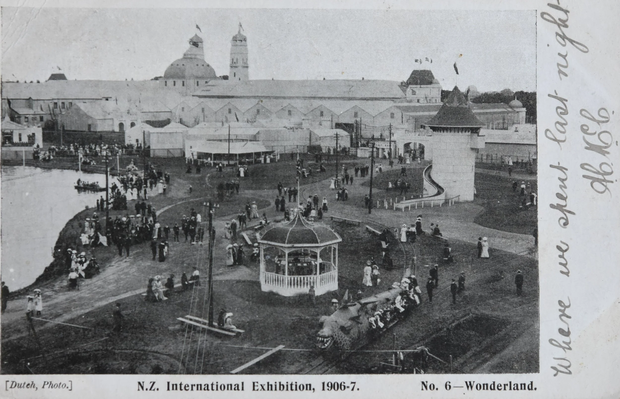 The postcard depicts a black and white photograph of the New Zealand International Exhibition, 1906 - 07, at Hagley Park, Christchurch. The exhibition opened on 1 November 1906 and the buildings covered 35 acres. The postcard is number 6 in the series and shows Wonderland. The postcard is addressed to Mr & Mrs Harding, Opunake, Taranaki, and is from Walter & Loveday, Roseneath. The note wishes Mr & Mrs Harding a happy Christmas and bright New Year. It is dated 20 December 1906.
