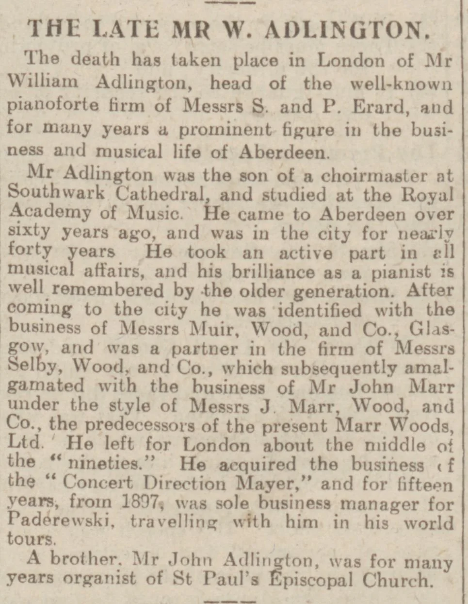 The Edinburgh Evening News of the 29th October 1921 states ‘The “Times” reports the death recently at his Thornton Heath residence, aged 87, of Mr William Adlington, pianist and head of the London firm of S. and P. Erard. He taught music in Aberdeen and Edinburgh, and subsequently became a concert impresario and sole business manager for Paderewski”.