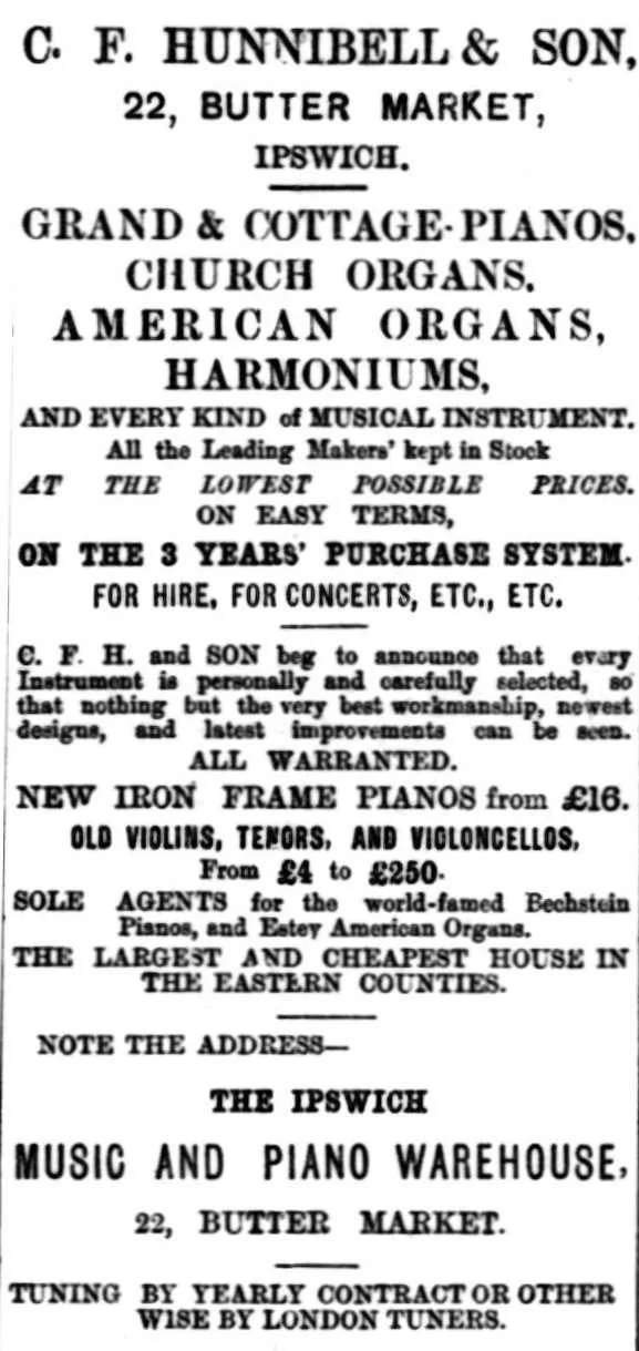 The East Anglian Times of the 8th April 1913 has a long obituary for Charles Hunnibell who, it seems, was called, Fred. According to the obituary he was born on the 16th April 1831 and as a child, learned to play the violin and later learnt the organ. He was the organist at the churches of St Nicholas, St Lawrence and St Margaret’s in Ipswich. From 1860 to 1866 he was the conductor of a Choral Society in Ipswich. Fifty years prior to his death Hunnibell started a music selling business. It started at 45 Butter Market however in about 1883 the business moved to larger premises on the south side of Butter Market. These new premises ‘were transformed in the handsome showrooms for pianos, etc becoming a centre of present-day musical life and knowledge’. It was also a fine art depot. The Hunnibell, of which there were 12 however only 6 were living. At the time of Hunnibell’s death one son was the organist at St James’s Church, Tunbridge Wells, another son was organist at St Mary, Ontario, one daughter was a well-known recitalist, another daughter played the double bass and another son was known as a cellist. The article states ‘amongst the many concerts which the Ipswich people have to thank the later Mr Hunnibell will be recollected the two occasions upon which Paderewski visited Ipswich’. Also Hunnibell was known as a fine linguist, he was also an artist and in later years took up photography.