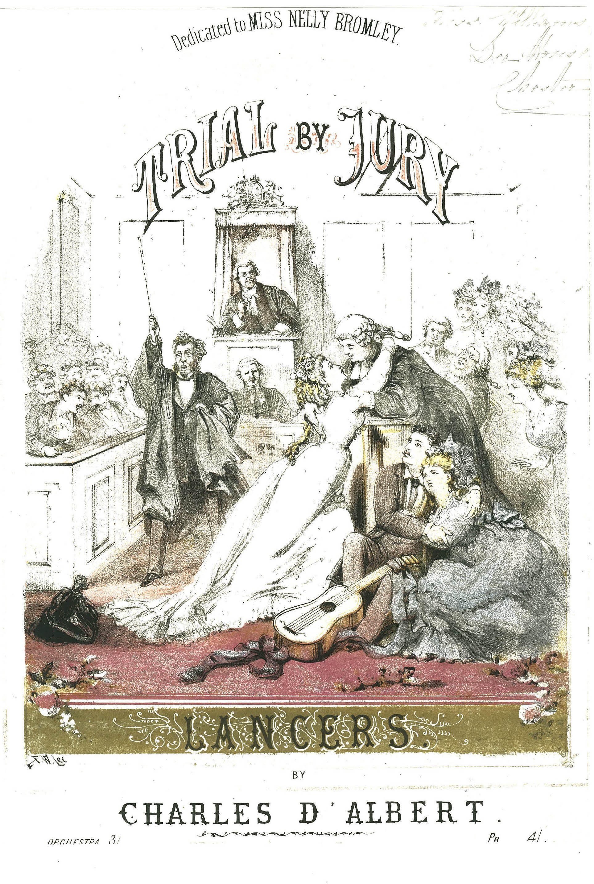 It was first performed at the Royalty Theatre on the 25th March 1875 and it ran for 128 (another source states 131) performances. It is short, it only lasts for 30 – 40 minutes. It was commissioned to follow an Offenbach comic opera, La Perichole. “Trial by Jury”was very successful, however La Perichole was not. The Evening Star notes on the 17th June 1875 ‘everybody, from the judge to the crier, sings; and there are on the piece some things quite in the Offenbachean vein, while in one quartette Mr Sullivan has admirably caricatured the famous quintette from Lucia. Trial By Jury, though short, is said to be one of the merriest bits of extravagance given to the stage for many a day. It is the only Gilbert and Sullivan operetta that does not contain any spoken dialogue. Gilbert used his short experience in the legal profession as material for this operetta.
